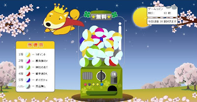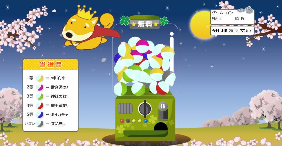 上図の様にいつも右下にあるチューリップがなく、「アレー」と思っていたら右からドル箱のキャラクターが走りました。「オーー」と思ったら1等でした。無料台なので、1等でも1ポイント(1円相当)なんですけどね。